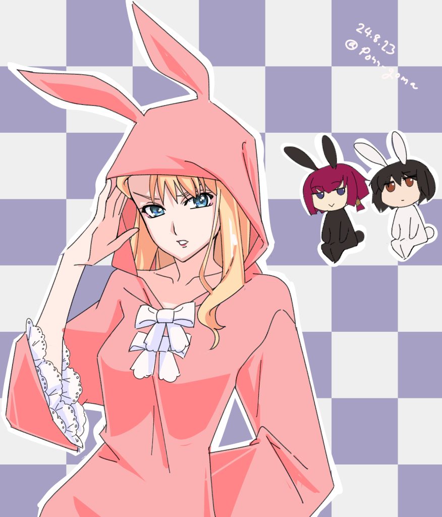 8月21日、バニーの日。最初はスタンダードにバニーガールを調べてたんですが肌色多いかなあ、いやミレイユさん普段と大差ないなあ、どうせなら意外性ほしいよなあということでフリフリパジャマ。楽しいですねフリル。白黒ウサギちゃんも本編でえぐい衣装が来たからむしろ控えめの方がマッドだよね(?)