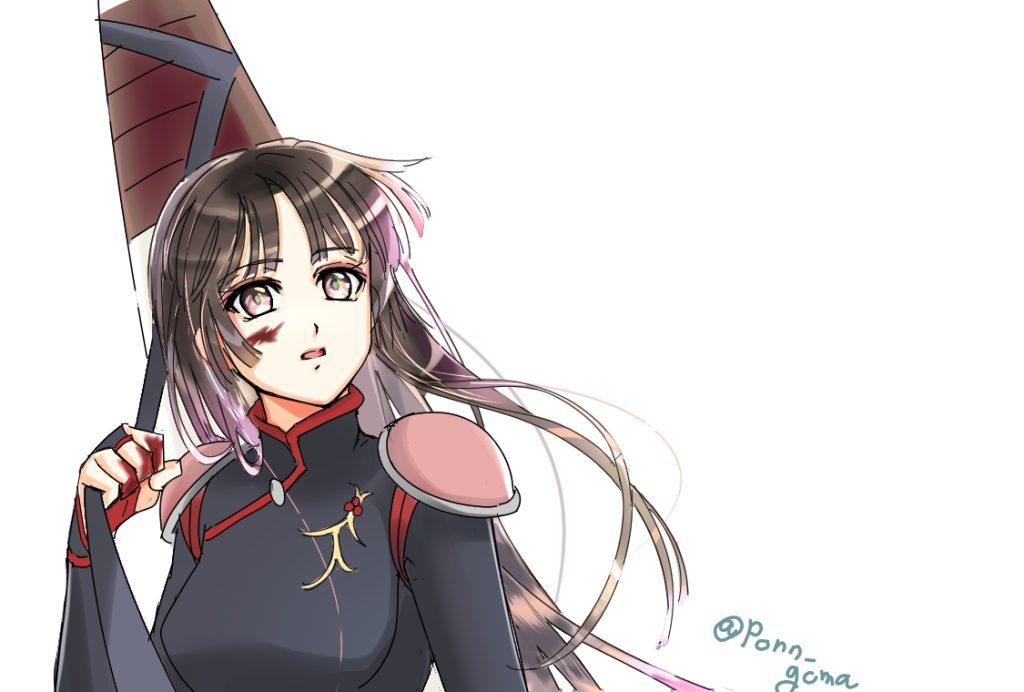 憑き物が落ちたような、ちょっと幼く見えるような顔を目指しました。血糊は右手のこれぐらいがSUKI。やっぱりアニメの印象が強くて、さんごちゃ(とおじさんのぐるぐる)は「濃い茶色(やや黄より)」でいつも塗ってます。この時は茶髪を光に透かした時にピンク~紫になるのがマイブームであった。かごめちゃんみたいな黒髪は青~紺で透けさせるのが好きです。