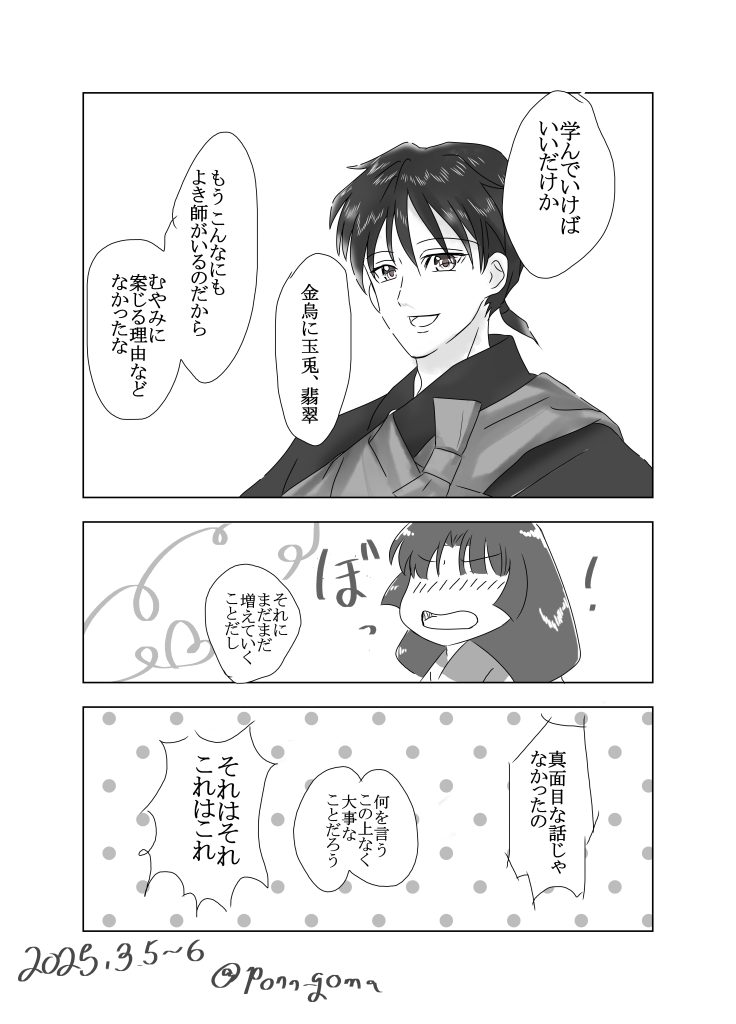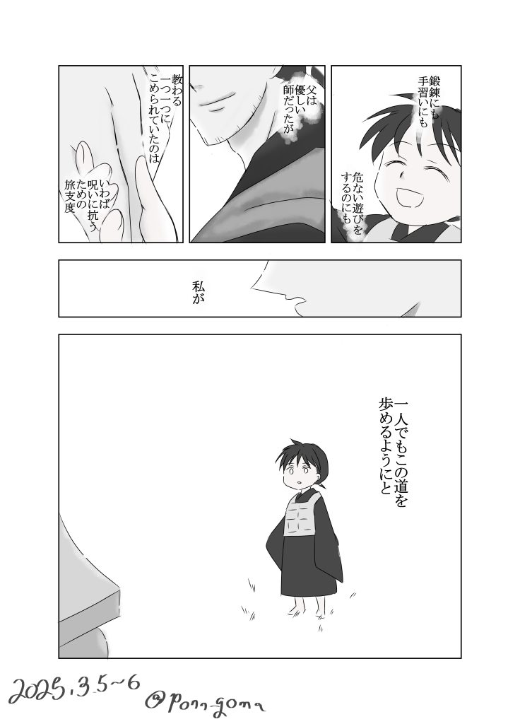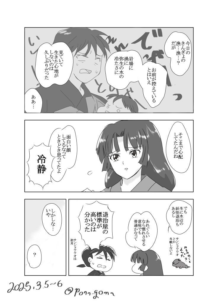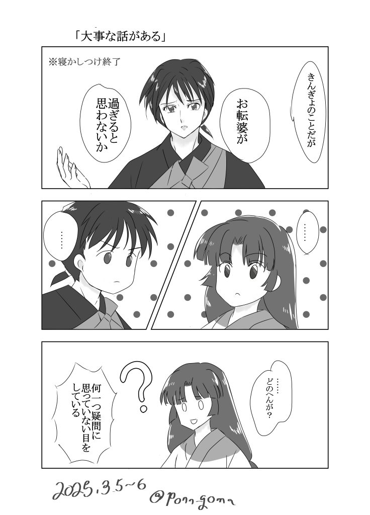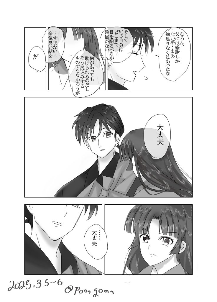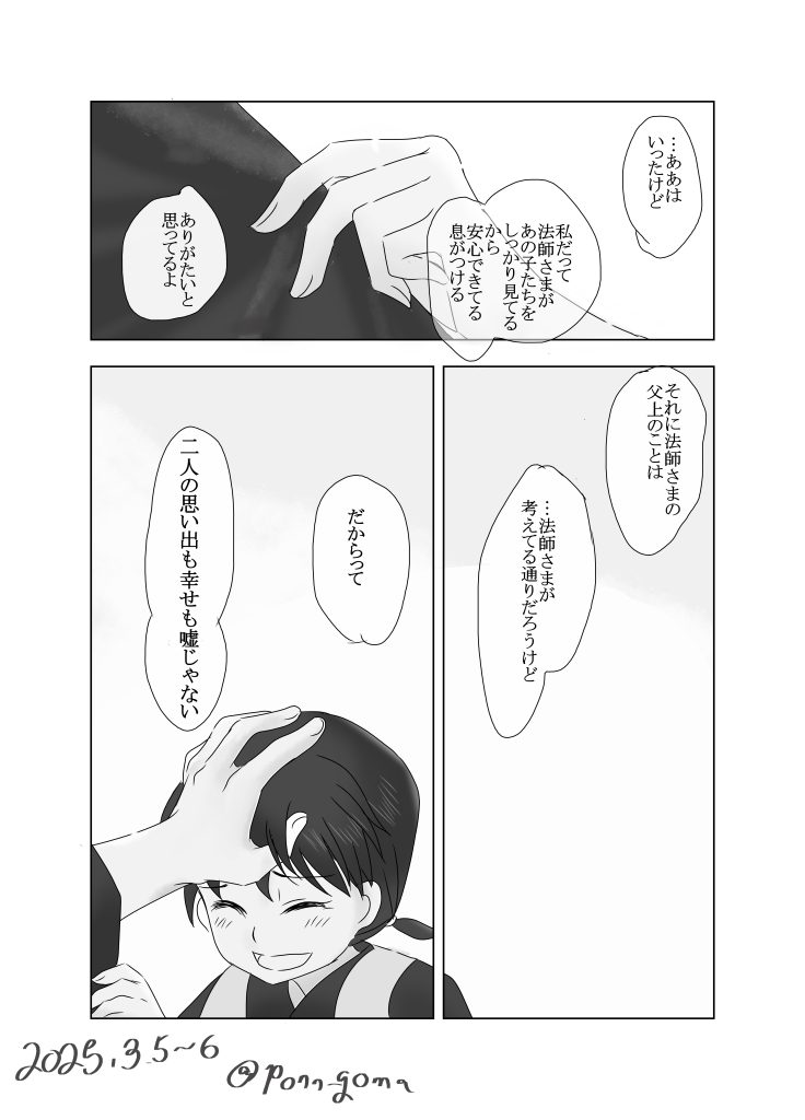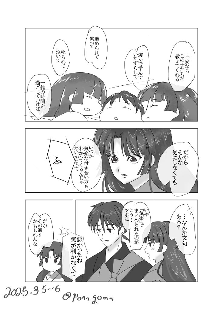 法師は子どもたちにすっごい過保護になるんじゃないかなあ、「この子たちは呪いを背負った旅をしなくていい」という要素が意識として強すぎて。と思いました。彼は自分の幼少期が特殊という自覚が痛いほどあるので、いざ自分が父親という立場になるとどこまで踏み込むべきなのか、逆に腰が引けたりとか、つい考えちゃう説。何しろ「私は人と深く関わるのが苦手」という自己分析で18年生きてきた男だからね。その辺は子供慣れ・集団慣れしている珊瑚ちゃんの方が割り切りが上手くて、すんなり本来の自分(大らかで前向きで気の良いお姉ちゃんつまりスパダリ)を取り戻してるんじゃないかと。彼女は逆に本編で琥珀君との関りから子の巣立ちを見守る母目線の成長も結果的に先取りしちゃった風もあるのですが、「こういうことを言ってほしいなあ」という夢を込めてセリフを整えて行きました。法師はゆっくり子供たちを通じて「父は幸せだった」「自分もあの瞬間幸せだった」と幼少期を肯定した上で前を向いていってほしいですね。