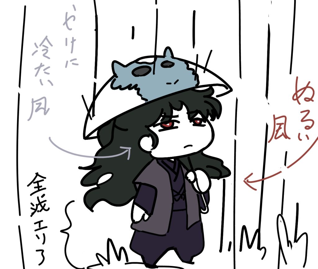 帰社中のどえれえ雨だったかな。もう頭しかかばえてないしぬるい風とひやっとした風が交互に吹き付けて来るしで。傘の柄お気に入りです。