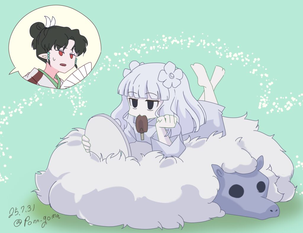 日中は屋内でまったりなお姉ちゃん。だって照り返しえげつないし。人をダメにする狒々クッションでアイス…いや、本当にダメにするんだよなこの狒々。神楽さんは神楽さんで日光を遮るものがない上空を飛ぶのはだいぶ気の毒。ハンディファンで送られる生ぬるい空気で追体験しよう。