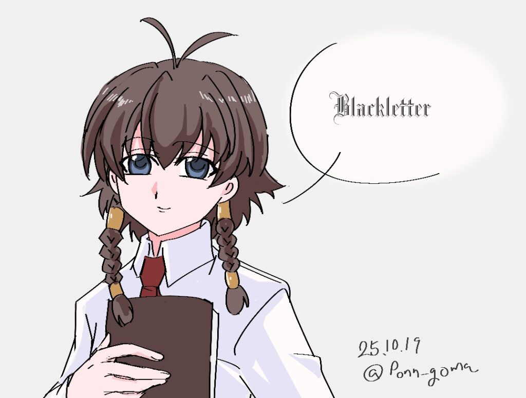 という無関係要素詰め合わせ。書体は燃えパカさんの「blackletter」、動画とwikiを見る限りブラックレター>テクストゥール が一番それっぽい。